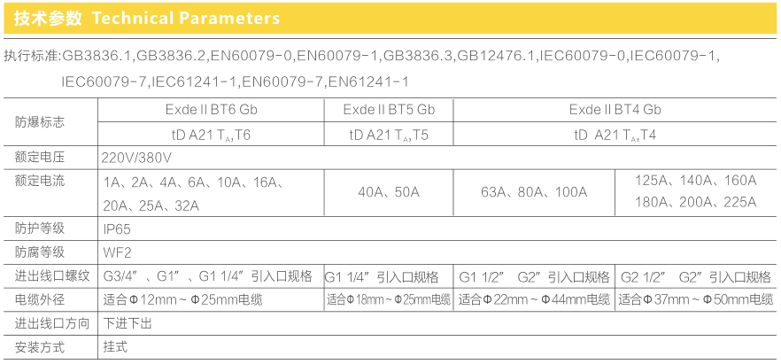 ● 内装防爆断路器,63A及以内的采用TDL防爆断路器模块,超过63A为特制防爆元件,高强度金属外壳,结构合理,防爆性能好;