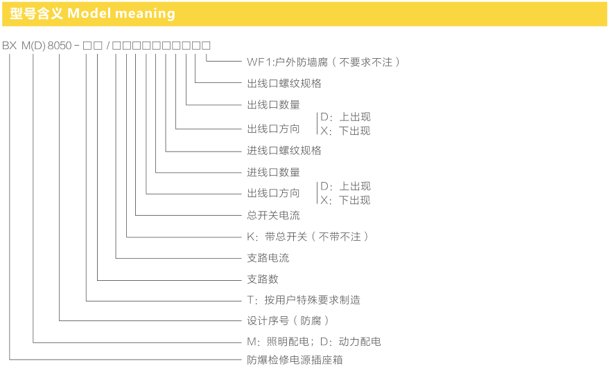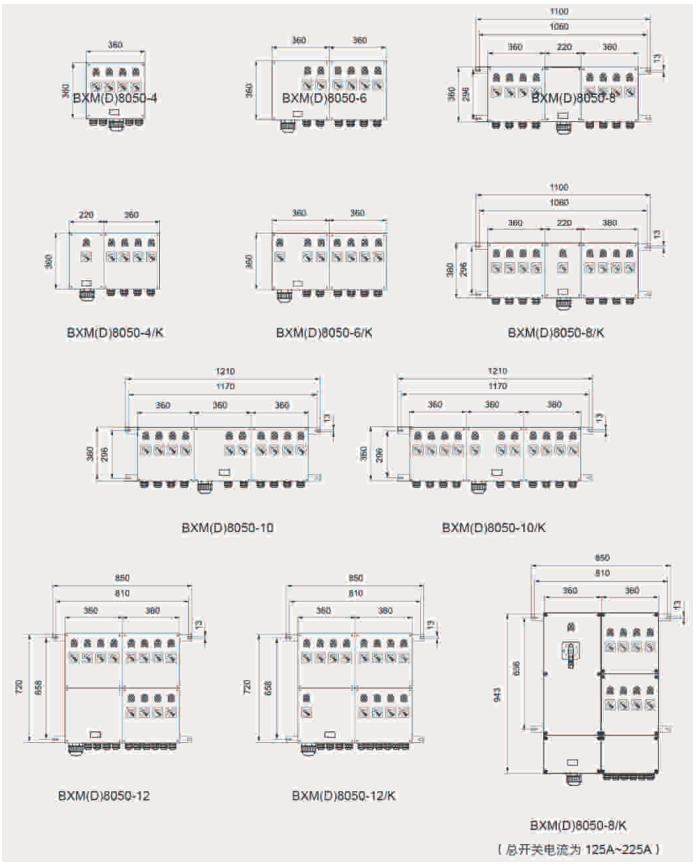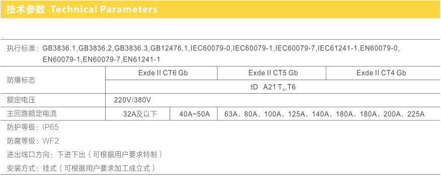 总开关,分开关操作面板区分明显,便于现场识别;内装断路器为特制的防爆原件;总开关电流最大可至225A;模块化设计,多回路组合。